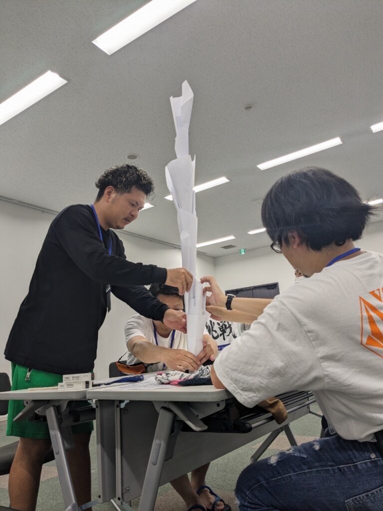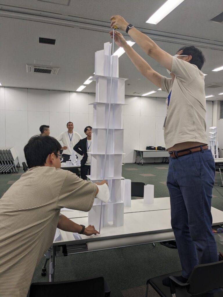 チーム力を高めるためにまずはペーパータワー!高く積み上げたチームが勝ち!!
