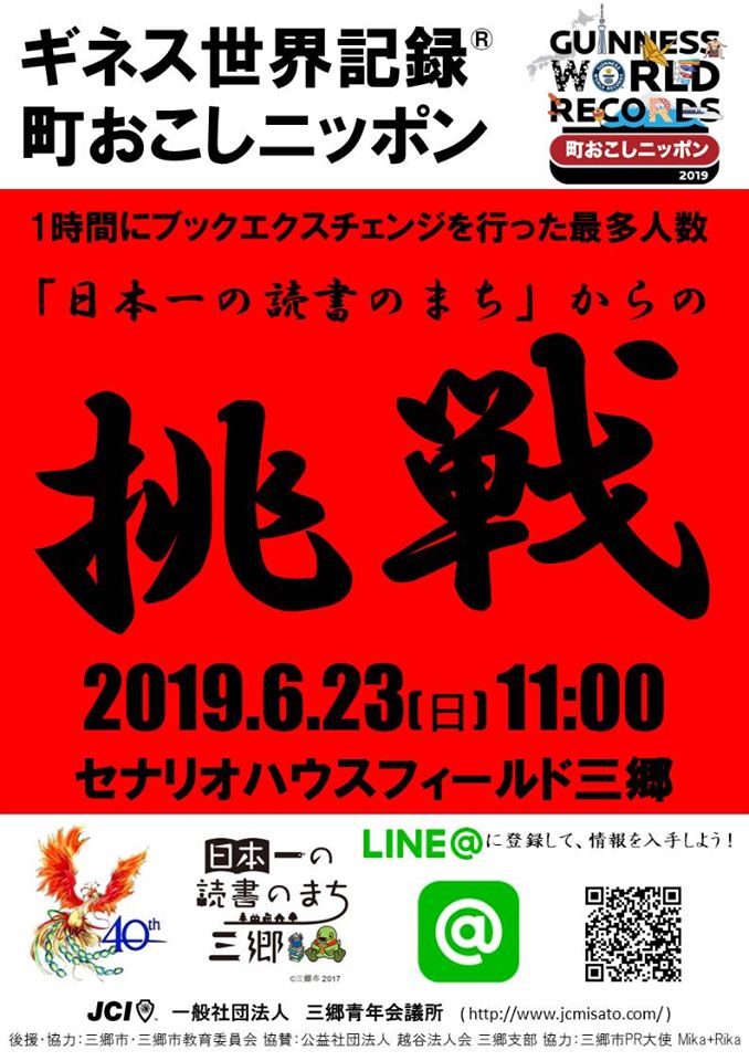 私ども一般社団法人三郷青年会議所は今年創立40周年を迎えました。この40周年の記念事業、そして私どもの6月例会としてこの度6月23日に「挑戦!!!~日本一の読書のまちから世界一の記録を~」を開催いたします。